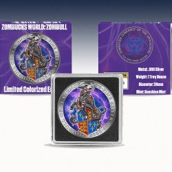 Each 1 oz Colorized Zombucks World Zombull Silver Round is packaged individually. These rounds arrive in a square capsule with a themed outer shipping sleeve. The colorized issues in this series have a limited mintage of only 1,200 rounds and deliver a unique take on the obverse depiction of the Zombull.