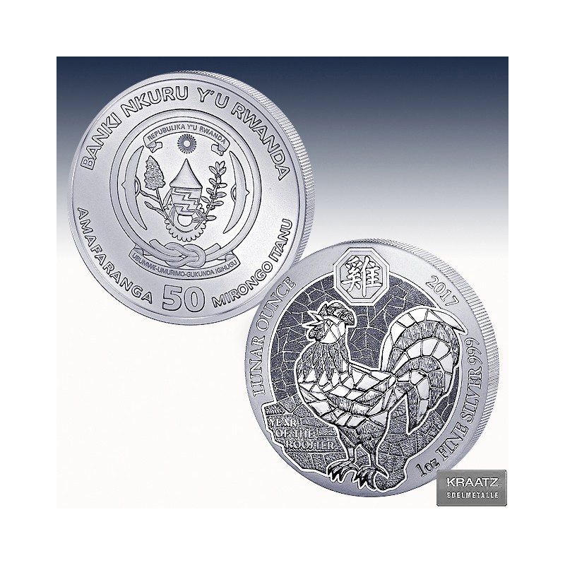 1 x 1 Unze (oz) Silber 50 RWF Ruanda "Lunar Serie Hahn 2017"