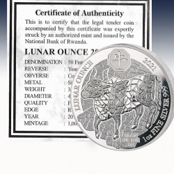| Hersteller: Republik Ruanda Nennwert: 50 RWF Francs Prägung: Polierte Platte Stückelung:1 Unze Material: Silber Feinheit: 999/1000 Gewicht: 31,103 Gramm Verpackung: gekapselt Durchmesser: 40 mm |