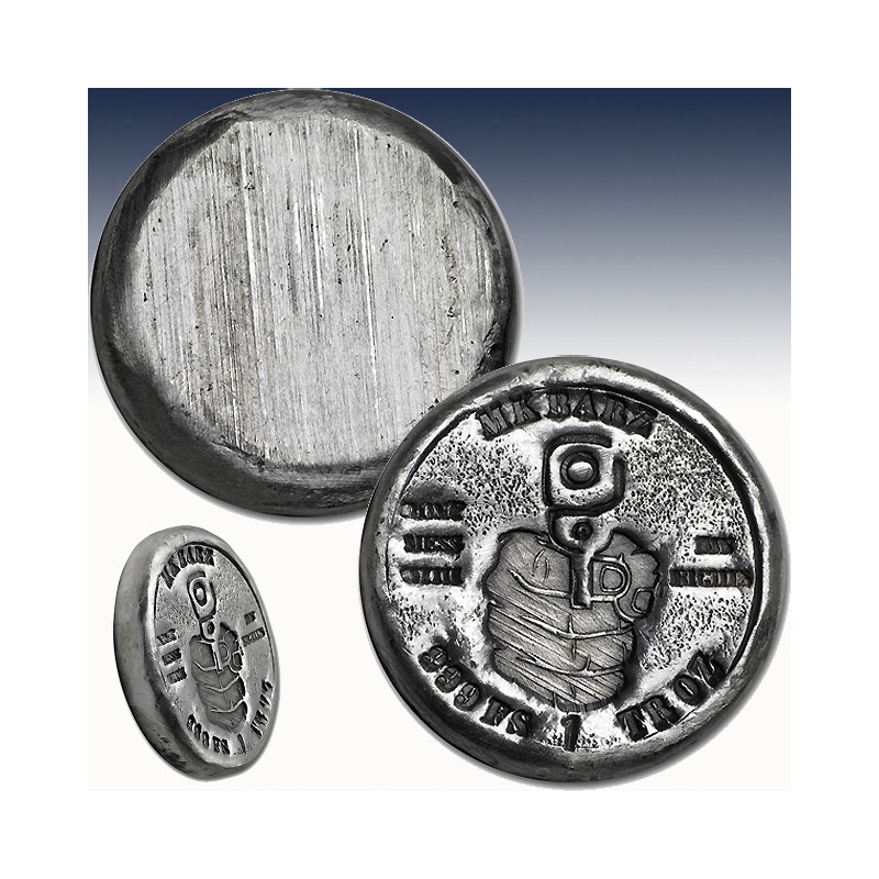 versehen - dem Totenkopf oder der Piratenflagge oder aber im Look einer Schatztruhe.This unique Silver round has been carefully poured and stamped. Each round features an inverted image depicting a closed fist with a handgun, adding an appeal of collectibility to the .999 fine Silver content.