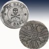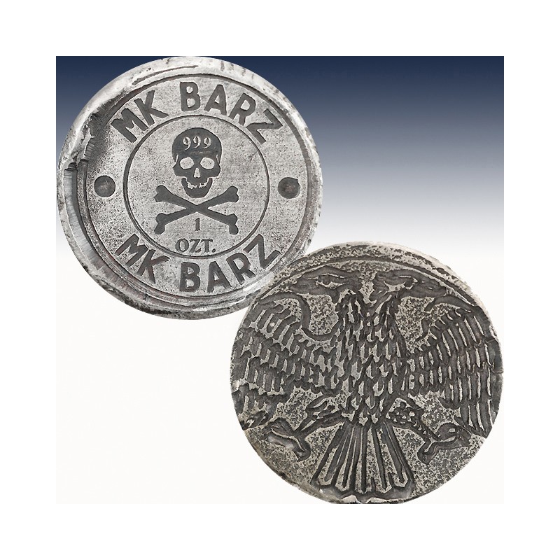 For the reverse of 1 oz Double-Headed Eagle Silver Rounds, the MK Barz logo is at the center. The skull-and-crossbones logo is accompanied by the brand name, weight, and purity of the silver round.