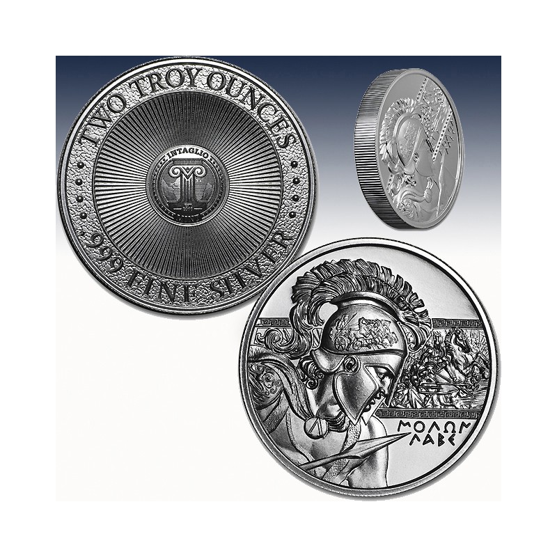 Molon Labe, meaning Come and Take It is a Greek phrase expressing defiance, spoken by the Spartan King Leonidas when the Persian armies demanded the surrender of their weapons. The expression is commemorated in this 2 oz .999 fine Silver round.