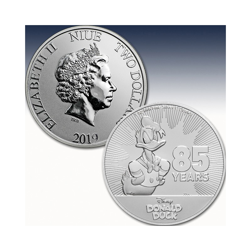 Bullion Silbermünze Donald Duck™ 85 Jahre Jubiläum wurde von der New Zealand Mint aus einer Unze 99,9 % Silber geprägt.