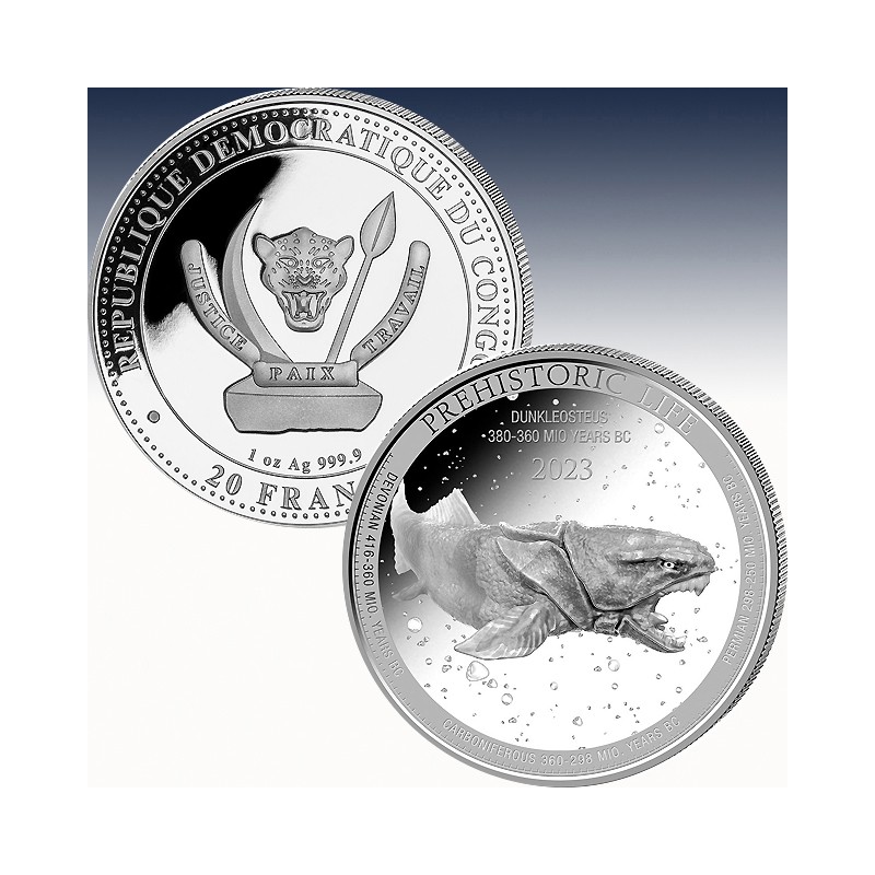 Oberhalb des Fisches sind die Inschriften "PREHISTORIC LIFE", "DUNKLEOSTEUS", "380 - 360 MIO YEARS BC" und das Ausgabejahr 2023 zu sehen. Auf der Rückseite ist das Wappen der Demokratischen Republik Kongo abgebildet.