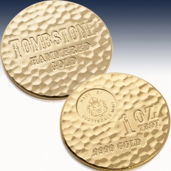 Own a piece of the Old American West with a hammered gold piece crafted in the historic nostalgia of the infamous town of Tombstone, Arizona, “The Town Too Tough to Die.” These 1 troy ounce solid gold rounds are crafted to be unique and each one varies just a touch. Slightly different shapes, textures, and personality. Included is a Certificate of Authenticity from the Scottsdale Mint and a mining-inspired money bag.