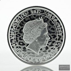 Dieses atemberaubende Design wird ergänzt durch das einmalige Leopardenhautmuster, das auf der Vorderseite der Münze hinter dem Bildnis der Königin Elizabeth II. Die komplette Auflage der 1 Unzen Republik Ghana Afrikanische Leopard Silbermünze BU (2017) ist auf nur 50.000 Stück limitiert.