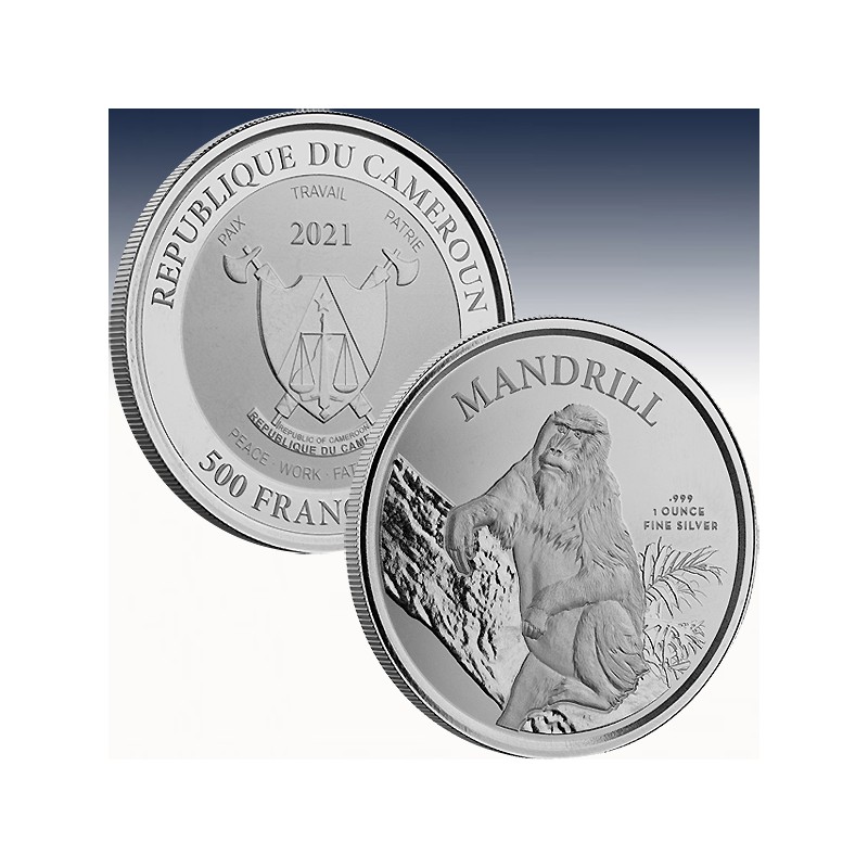 These Cameroon legal tender coins are manufactured and distributed by Scottsdale Mint. The Mandrill 1 oz Silver BU is sold in plastic capsules and has a limited mintage of 15,000 oz. The Mandrill 1 oz Silver and 1 oz Gold color coins (Mintages of 1,500 oz and 100 oz respectively) are sold in capsules with a Scottsdale Mint display case with a certificate of authenticity.