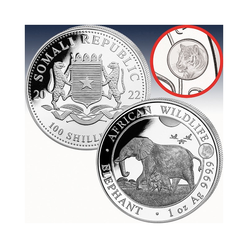 1 x 1 oz Silberünze 100 SH Somalia "Privy Mark Elefant Tiger 2022"