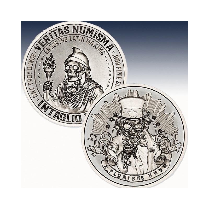 Struck in 1 troy ounce of .999 fine silver, this 39mm round presents a haunting allegory on its obverse: a skeletal Uncle Sam, top hat adorned with stars, beckons with bony finger as ghostly tendrils coil around him. Behind, jagged rays pierce the skyline, evoking both brilliance and decay. Beneath, the maxim E Pluribus Unum is inscribed as a chilling reminder of unity under strain. The reverse bears the common hallmark of the series: the robed skeletal philosopher, torch aloft, beneath the banner “Enduring Latin Maxims” and framed by the Veritas Numisma title.